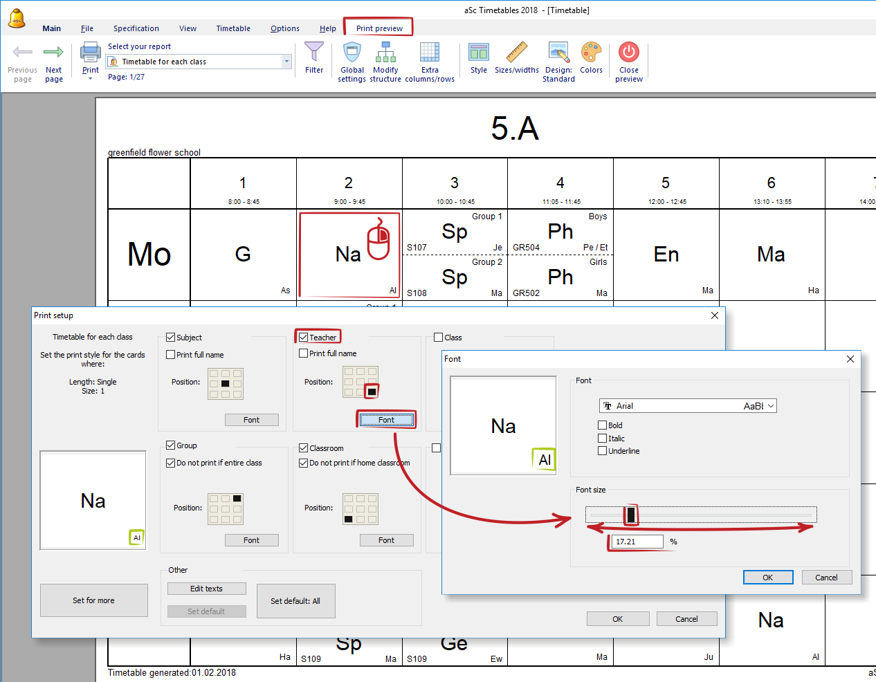 I want to print also teachers' names in timetable printout/ need bigger font size