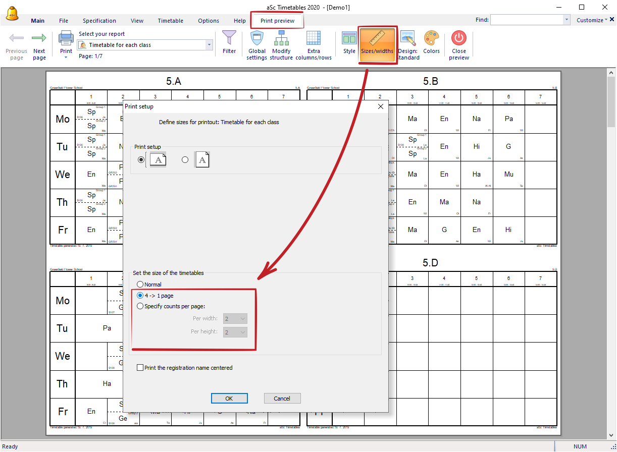Select icon Sizes. Here you can specify how many timetables shall be packed onto one sheet of paper. This can be good to save paper when printing timetables for students or classes. Select timetables per width and per height or just quickly select 4->1:
