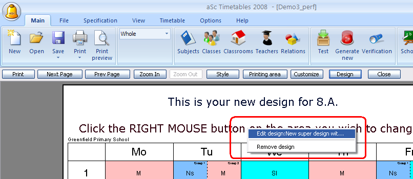 Then apply it to the selected classes or teachers and press right mouse button to Edit the design: