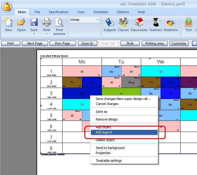 After clicking OK you can move the legend to the desired position, resize it. You can also add other legends(teachers, subjects) or change the look of the legend by right clicking on it.