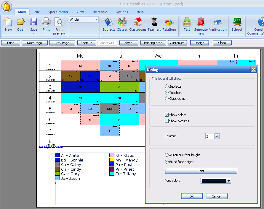 Below each timetable you can print legend that shows list of subjects, teachers or classrooms so that your students will understand the abbreviation in the timetable.