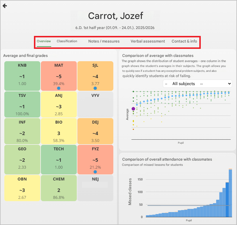 At the top of the page, you can switch to additional tabs with more information about the student.