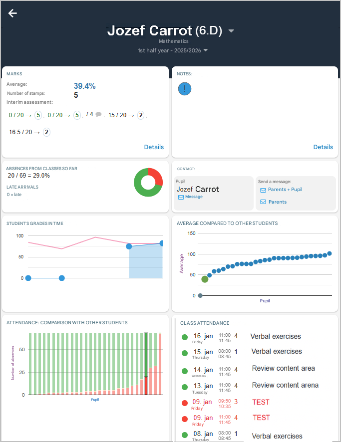 In each section, you can see a clear visual chart as well as a list of specific students — both those who are performing well and those who may be struggling in that particular area and might need support. You can click on any student in the list or directly in the chart to view a detailed overview of that student’s information for the current school year.