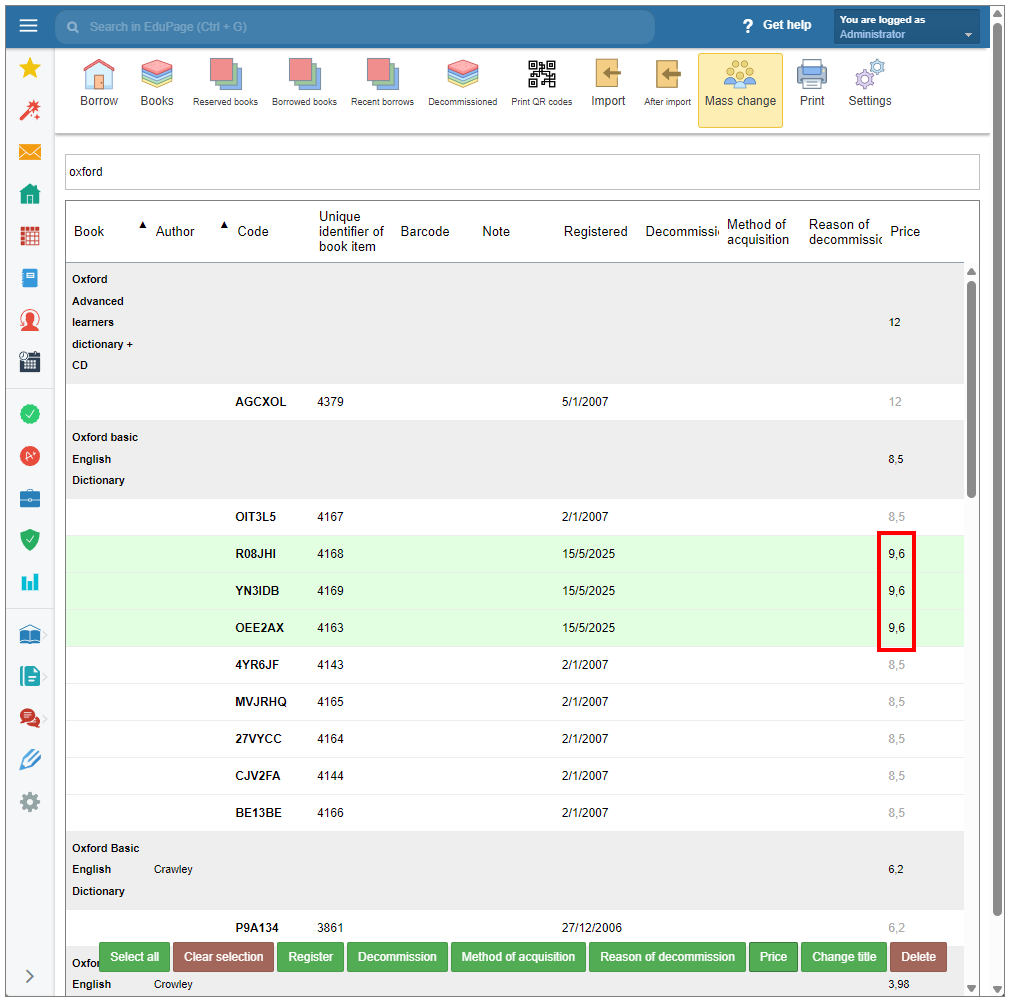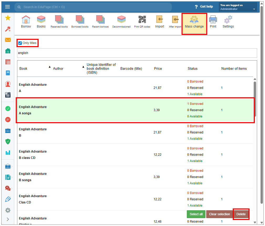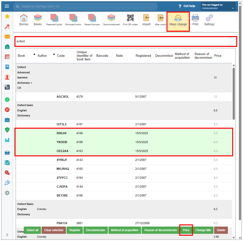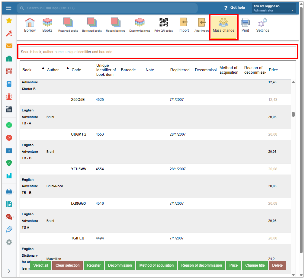 In the top menu select “Mass change”. If necessary, enter the textbook specification data into the search field located below the top menu.