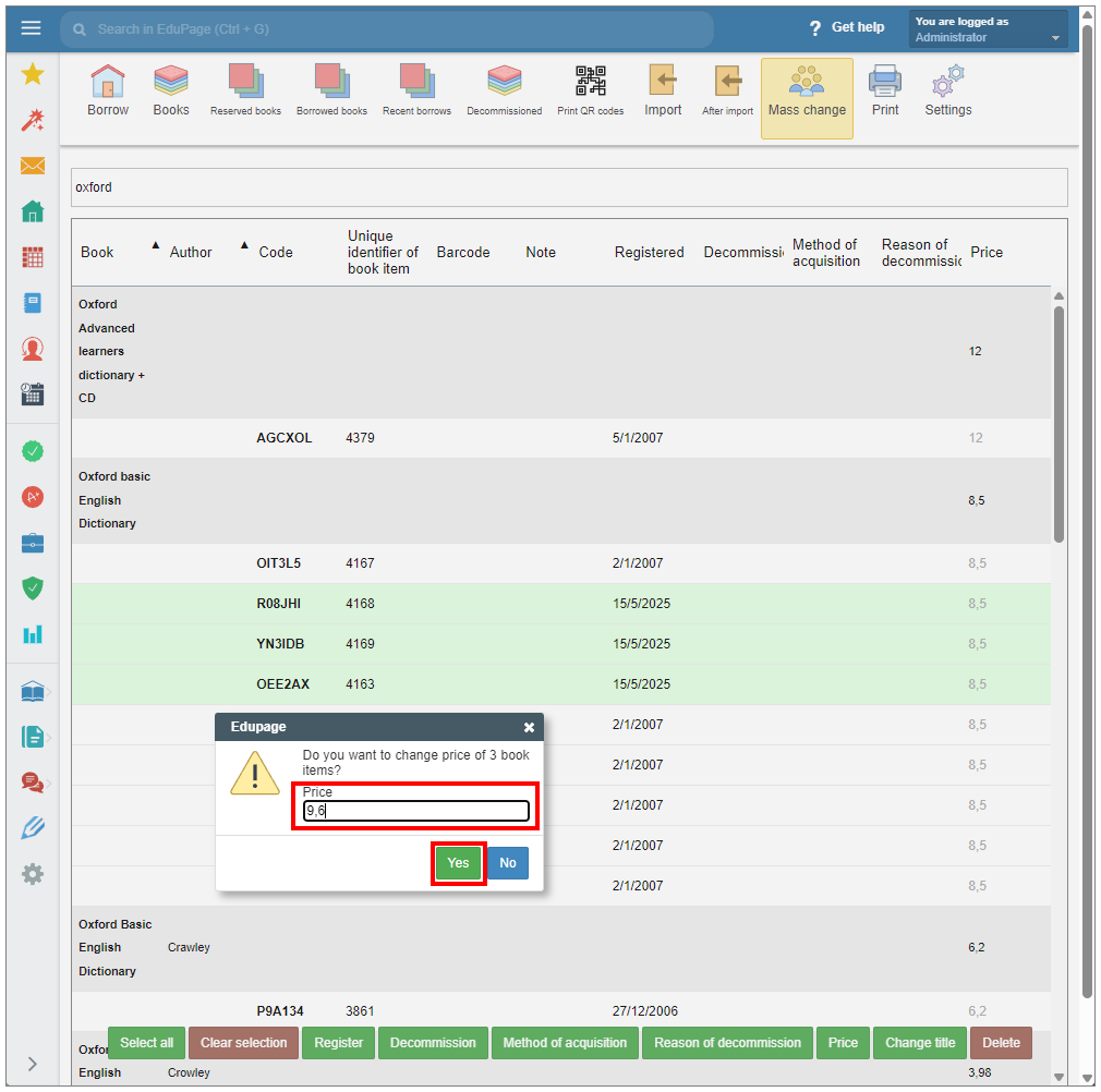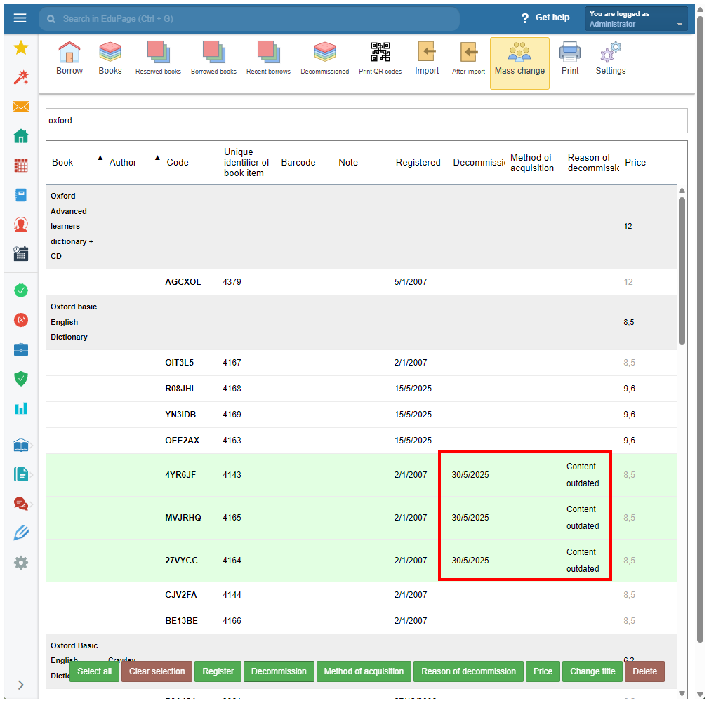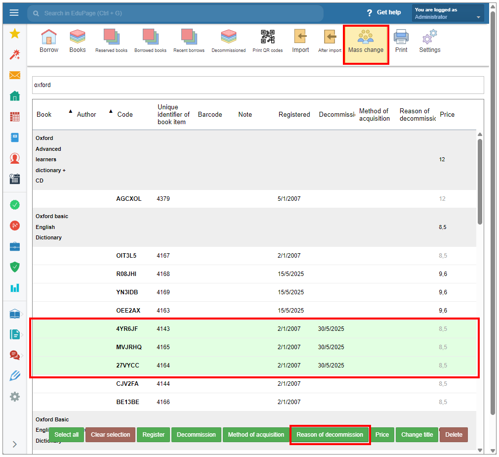 In the top menu select “Mass change”. If necessary, enter the textbook specification data into the search field located below the top menu.
