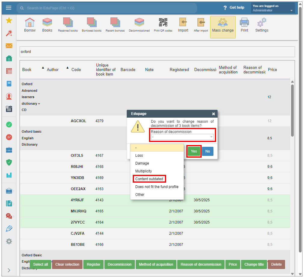 To perform mass changes of acquisition method, reason of decommission, decommission date, registration date, title change, price change, or to delete items, use the “Mass change” feature.