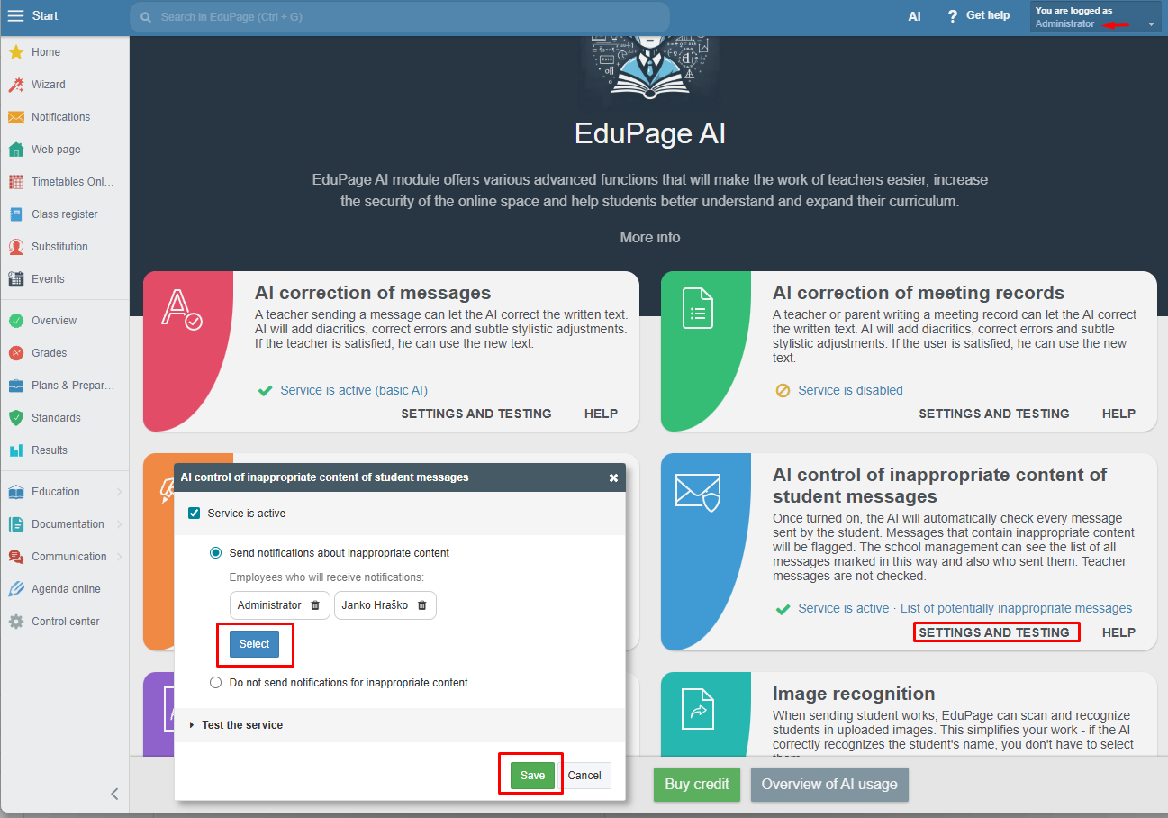 By default, inappropriate content notifications are sent to the school administrator. Since the administrator account does not have a mobile app login, they do not receive instant notifications. It is therefore advisable to add one or more employees who use the mobile app. Most messages likely will not require immediate action or any action at all—for example, when children occasionally use inappropriate language. However, at the very least, you will have greater peace of mind knowing that nothing is happening at school via EduPage that would require immediate assistance for a student.