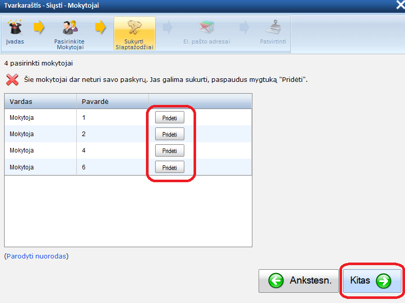 Programa gali paprašyti, kad Jūs sukurtumėte paskyras naujiems mokytojams. Taip nutiks, jei Jūs siunčiate el. laišką ir naujiems mokytojais, kurie buvo įtraukti į šį tvarkaraštį.