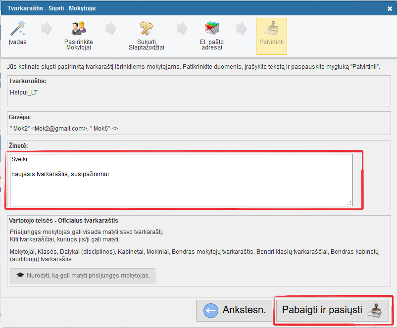 Po to paspauskite mygtuką "Baigti" ir programa išsiųs laiškus mokytojams.