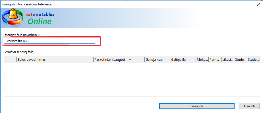 Tvarkaraštis bus išsaugotas Jūsų mokymo įstaigos paskyroje edupage.org serveryje.