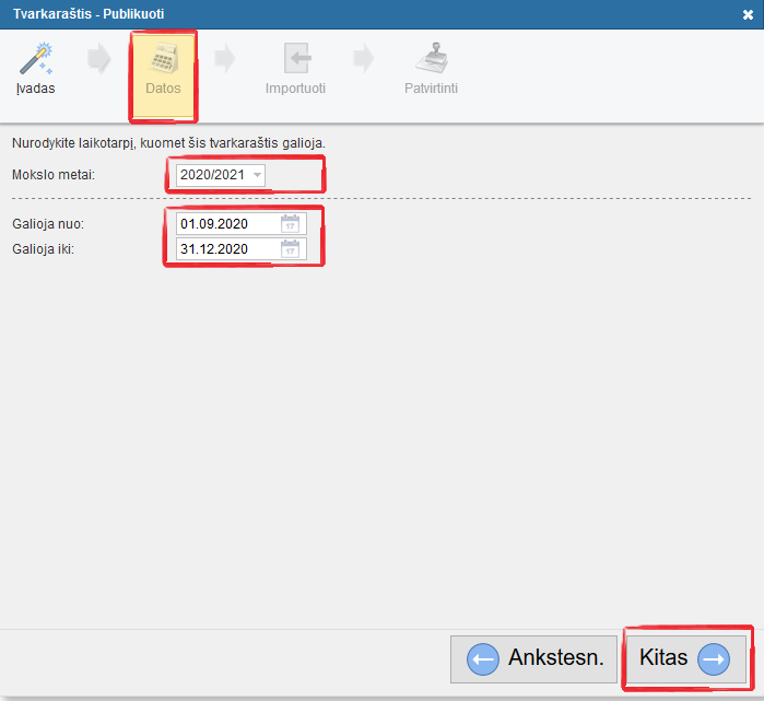 Kitu žingsniu galima importuoti visus duomenis iš tvarkaraščio į "Tvarkaraščius Internete".