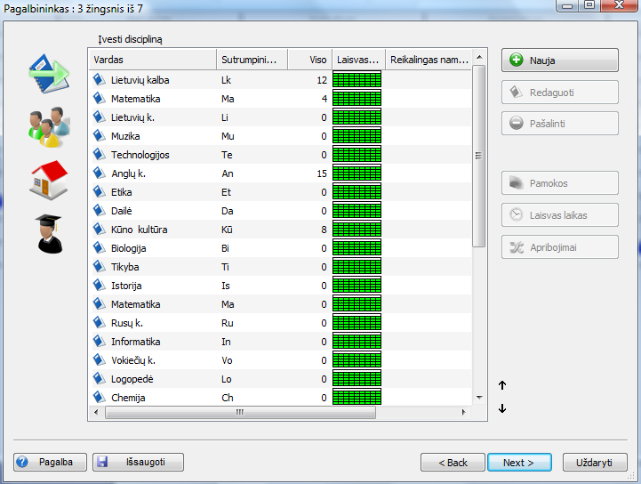 Kokią informaciją galima įvesti kiekvienai disciplinai:
