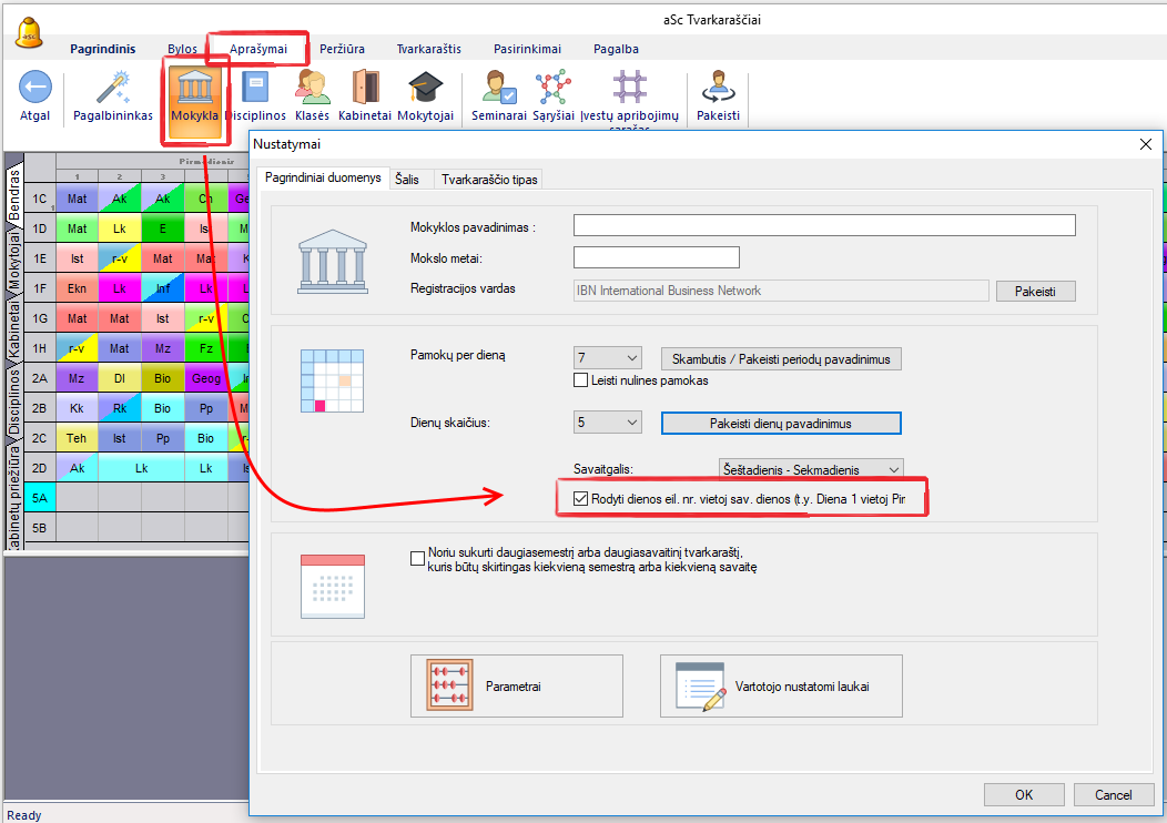 Pasirinkite meniu komandas "Pagrindinis, Mokykla":