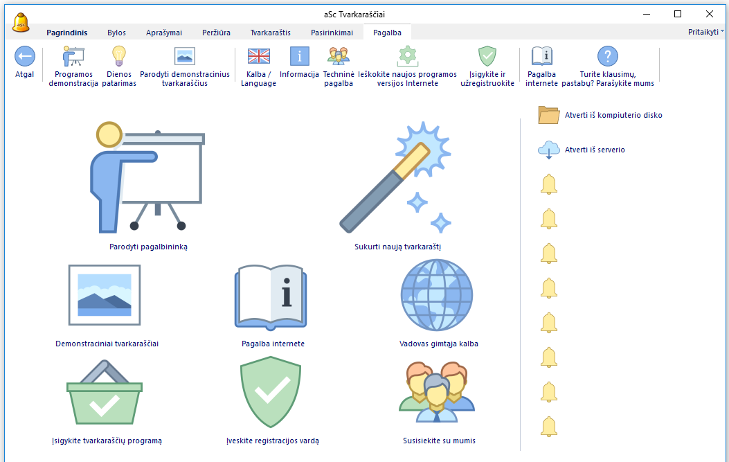 Po to galite pradėti dirbti su programa, pasirinkę Sukurti naują tvarkaraštį. Žiūrėkite: Naujo tvarkaraščio sudarymas arba jau sukurto redagavimas