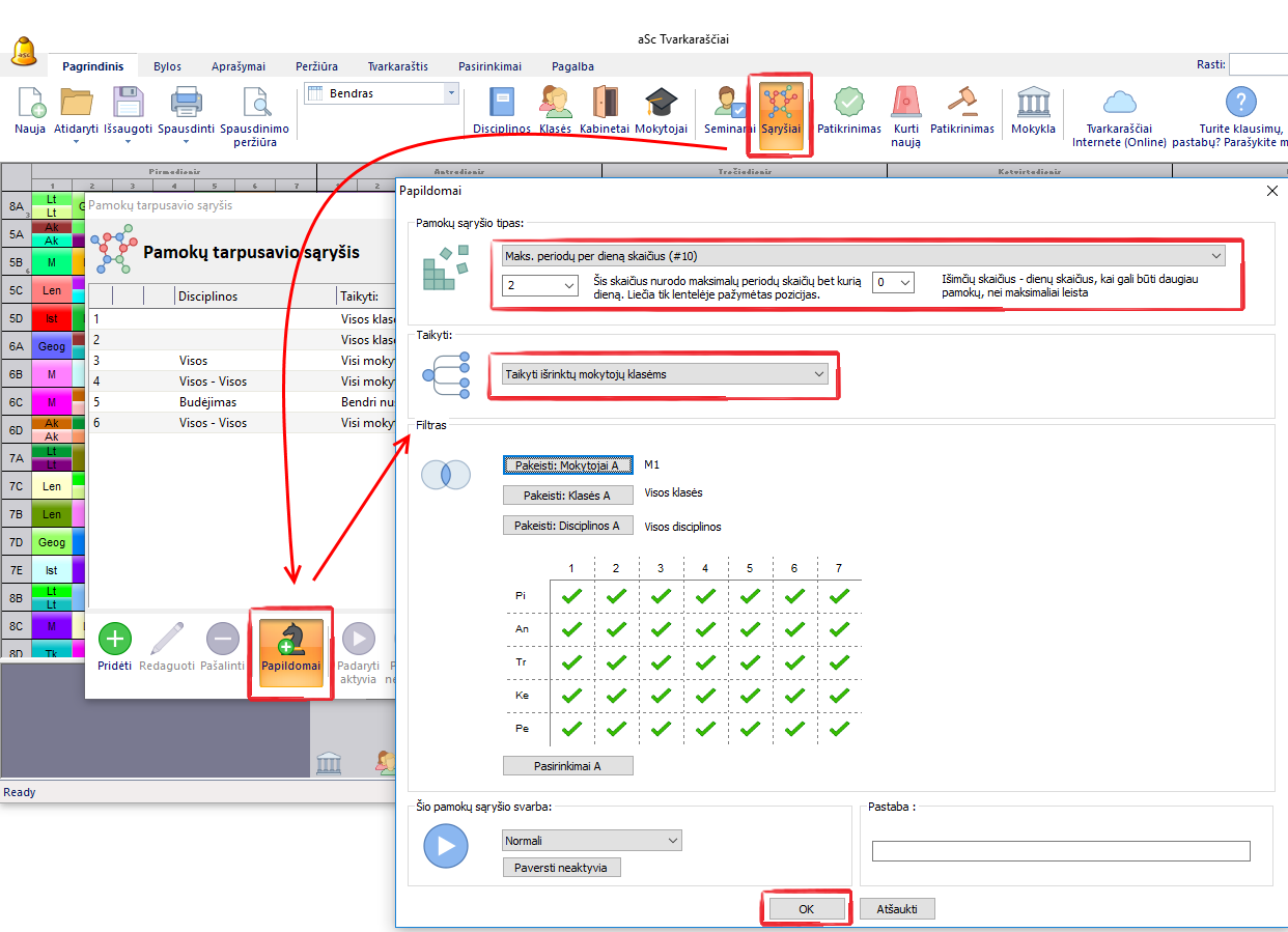 Jei, pavyzdžiui, pasirinksite "Taikyti išrinktiems mokytojams", tai reikštų, kad kiekvienas mokytojas gali turėti maksimum 2 pamokas per dieną.