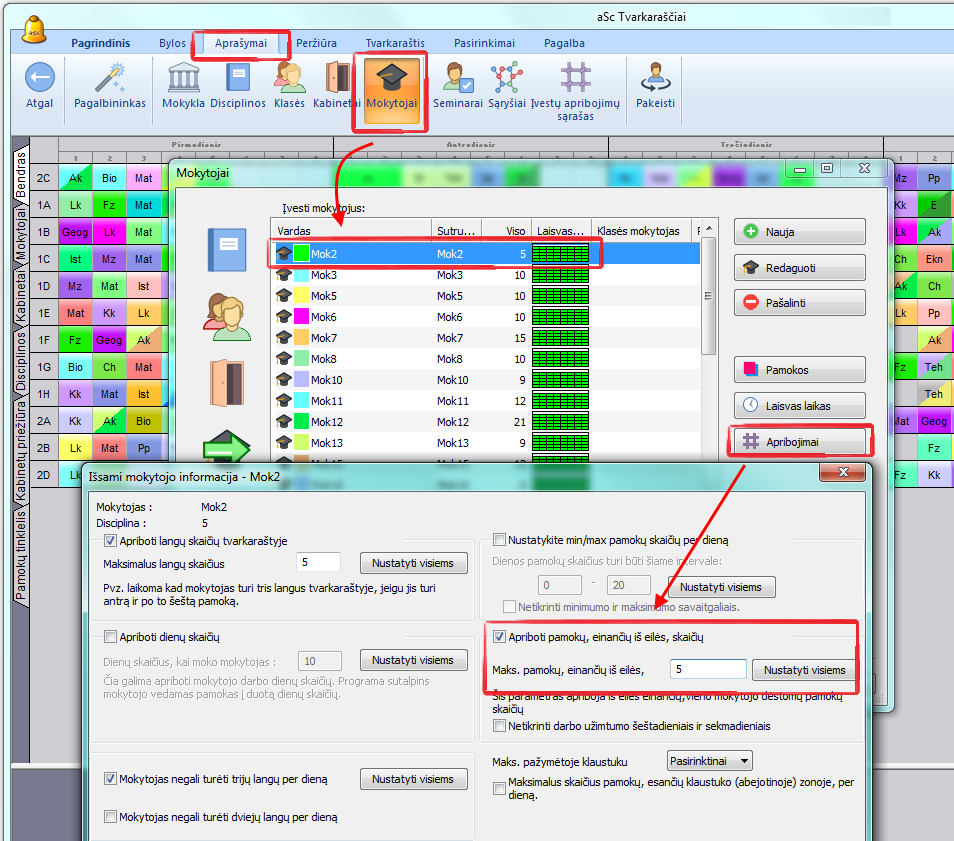 Nuosekliai einančių pamokų skaičių galima nurodyti ir kiekvienam mokytojui individualiai: