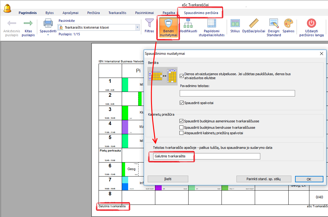 Pagal nutylėjimą programa spausdina paskutinio keitimo datą apatiniame kairiajame tvarkaraščio kampe.