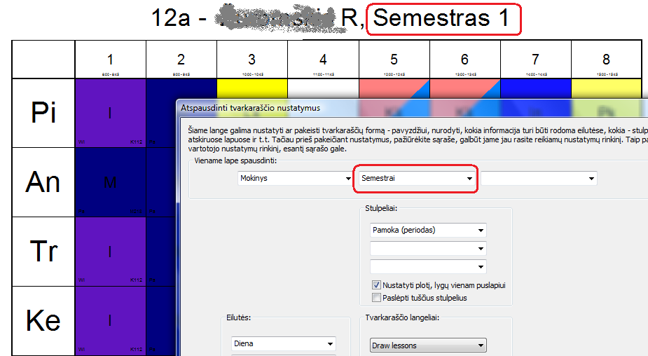 Jei reikia, galite atspausdinti ir tvarkaraštį kiekvienam mokiniui, nurodydami spausdinti ir semestro numerį: