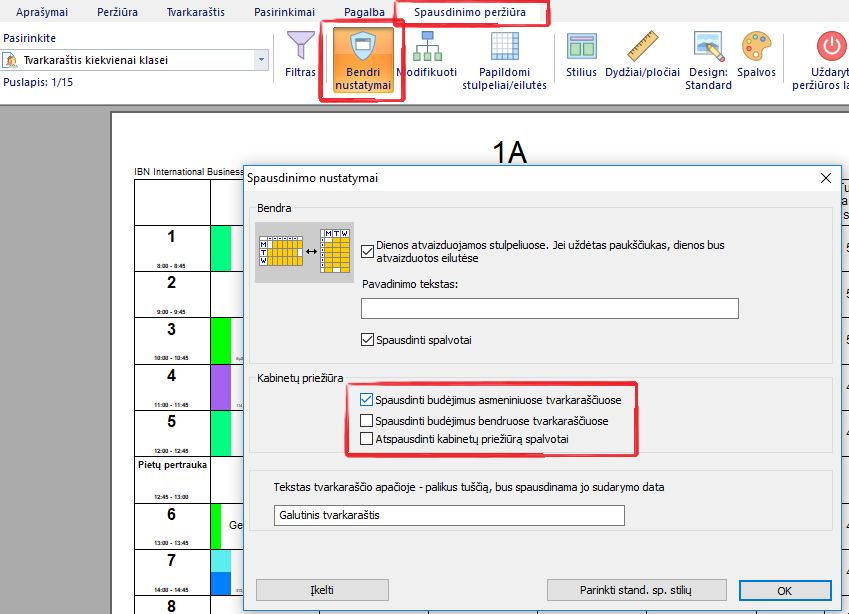 Spausdinimo peržiūros lange pasirinkite "Bendri nustatymai" ir pasirinkite, kad būtų spausdinami budėjimai bendruose ar individualiuose tvarkaraščiuose: