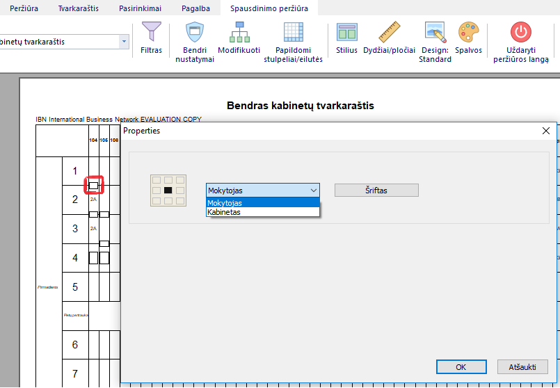 - jei pasirinksite spausdinti budėjimus spalvotai, kabinetų tvarkaraščių fonas bus mokytojo spalvos, o mokytojų tvarkaraščių - fonas bus kabineto spalvos.