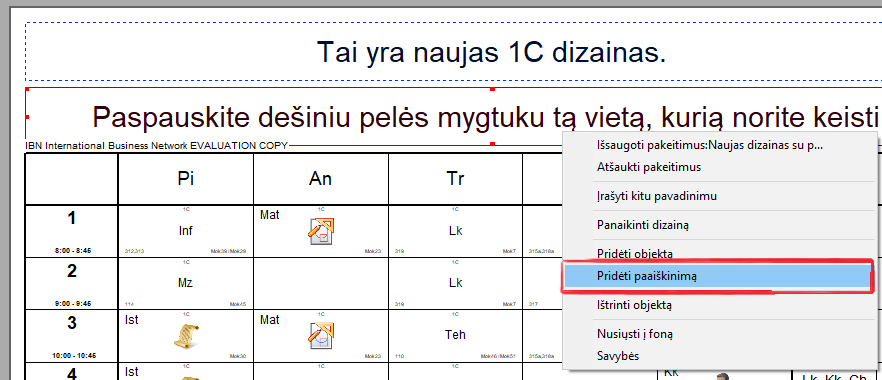 Po to galite perkelti paaiškinimų lentelę į norimą vietą, pakeisti jos dydį. Galite pridėti kitus paaiškinimus (mokytojų, dalykų (disciplinų), kabinetų) ar pakeisti išvaizdą, paspaudus paaiškinimų langelį dešiniu pelės mygtuku.