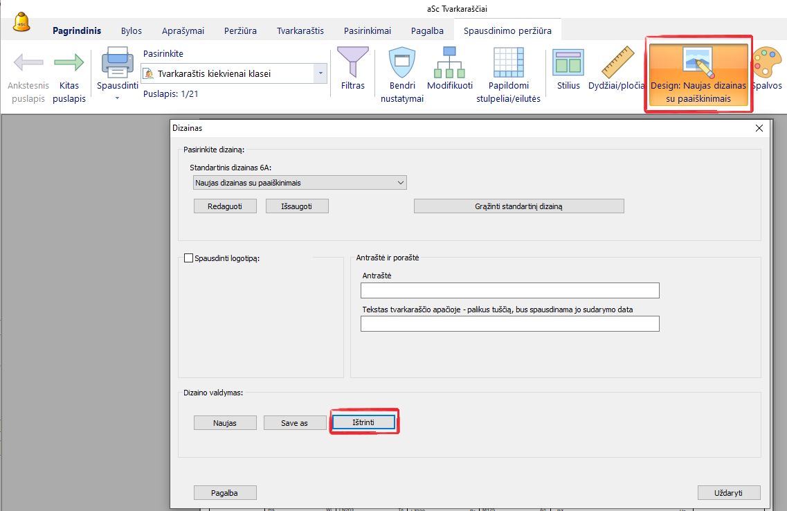 Jeigu Jūs sukūrėte dizainą tvarkaraščiui viename kompiuteryje, jis nebus automatiškai perkeltas į kitą kompiuterį su tvarkaraščio byla.