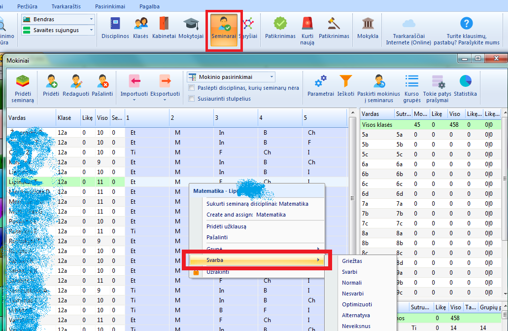 Galite pasirinkti vieną ar kelis mokinius, spustelti dešiniuoju pelės mygtuku ir pasirinkti svarbą: