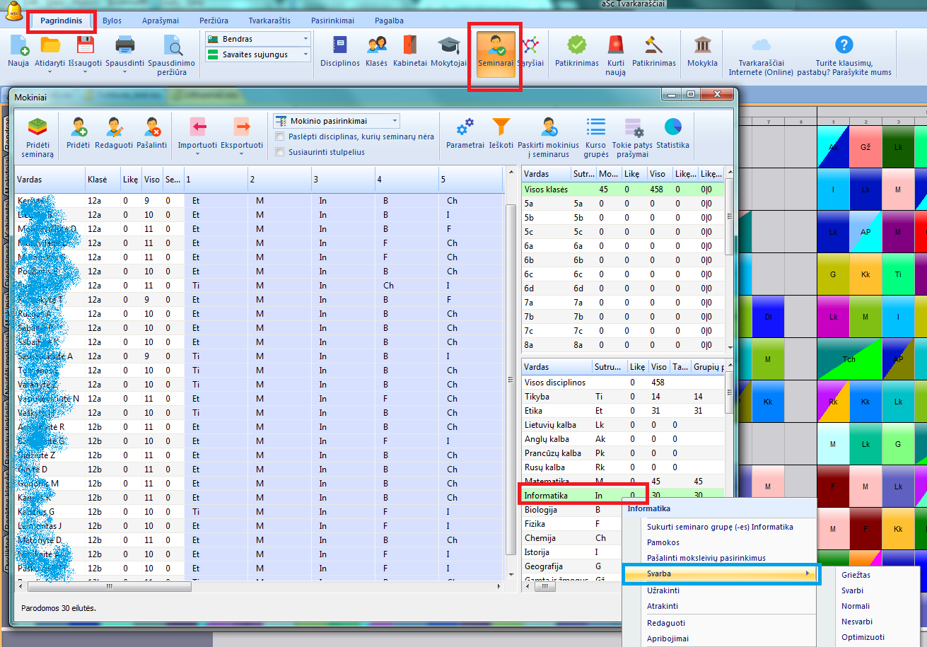 Alternatyva - šį pasirinkimą reikia nustatyti mokinio seminarų lange. Tai reiškia, kad šio seminaro pasirinkimas yra alternatyvus, tai yra jei pagrindinis pasirinkimas nebuvo įgyvendintas, mokinys gali būti paskirtas į šį alternatyvų seminarą.