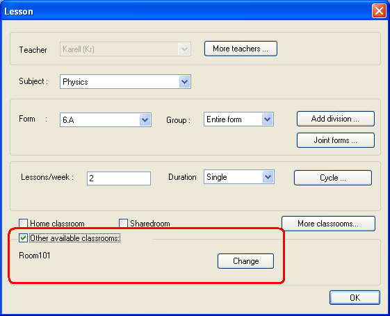 لكل درس تستطيع تحديد الغرف الدراسية المتاحة. بالتزامن مع البناء الآلي البرنامج سوف يختار ويسجل الدرس لواحدة من الغرف الدراسية المتوفرة.