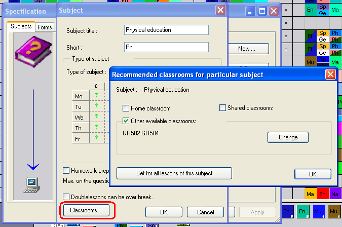 لكل مادة تستيطع تحديد الدروس لهذه المادة التي سوف تكون في الفصل الغرفة الدراسية المعينة: