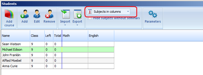 ניתן להשתמש CTRL ובחרו יותר שורות (תלמידים) ולאחר מכן לחץ קליק ימני והוסף את הנושאים ליותר תלמידים.