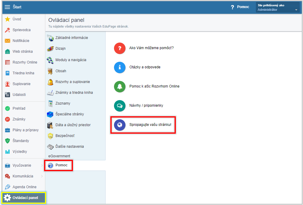 Po prihlásení sa ako administrátor zvoľte možnosť Ovládací panel - Pomoc - Spropagujte Vašu stránku.