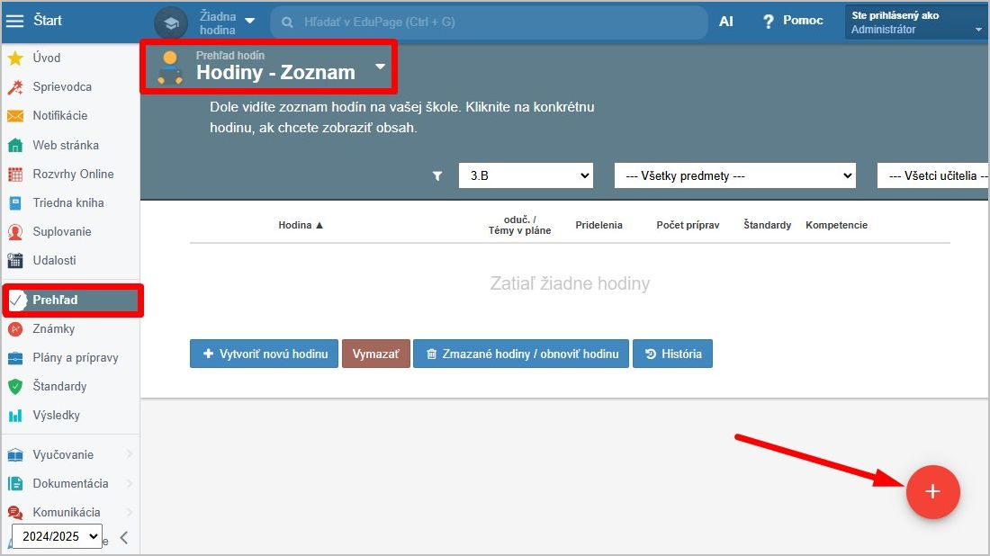 Keďže ste prihlásený ako administrátor, musíte vybrať učiteľa, ktorý túto hodinu bude učiť, ináč učiteľ vami vytvorenú hodinu neuvidí.