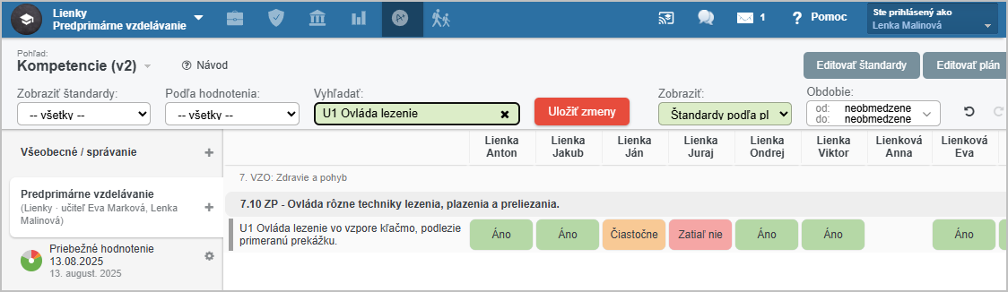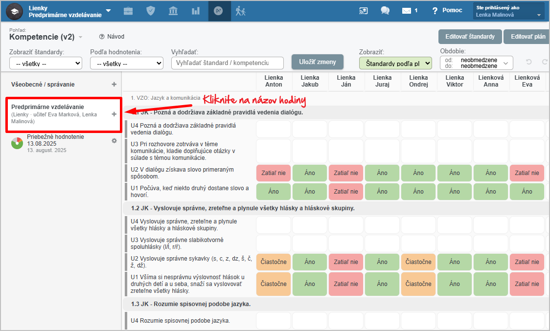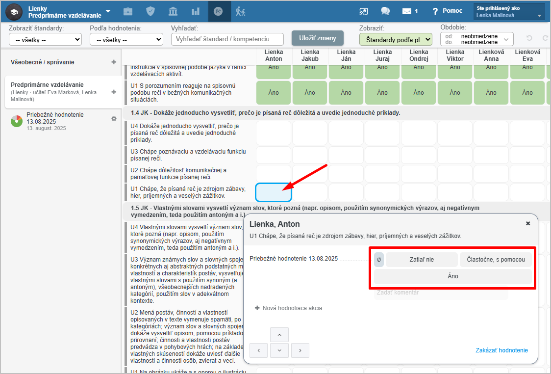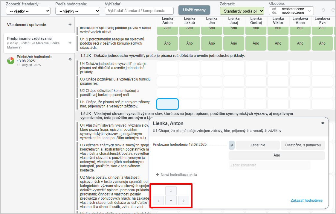 Pomocou šípok sa môžete posunúť na ďalšieho žiaka (šípky doprava/doľava), resp. na ďalší štandard (šípky hore/dole).