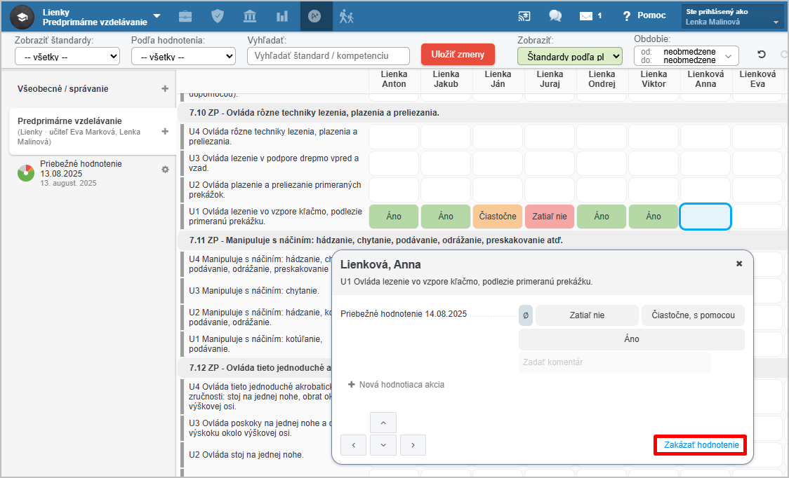 Ak niektorý zo žiakov nemá byť v danom štandardne hodnotený, napr. zo zdravotných dôvodov, nastavte "Zakázať hodnotenie".