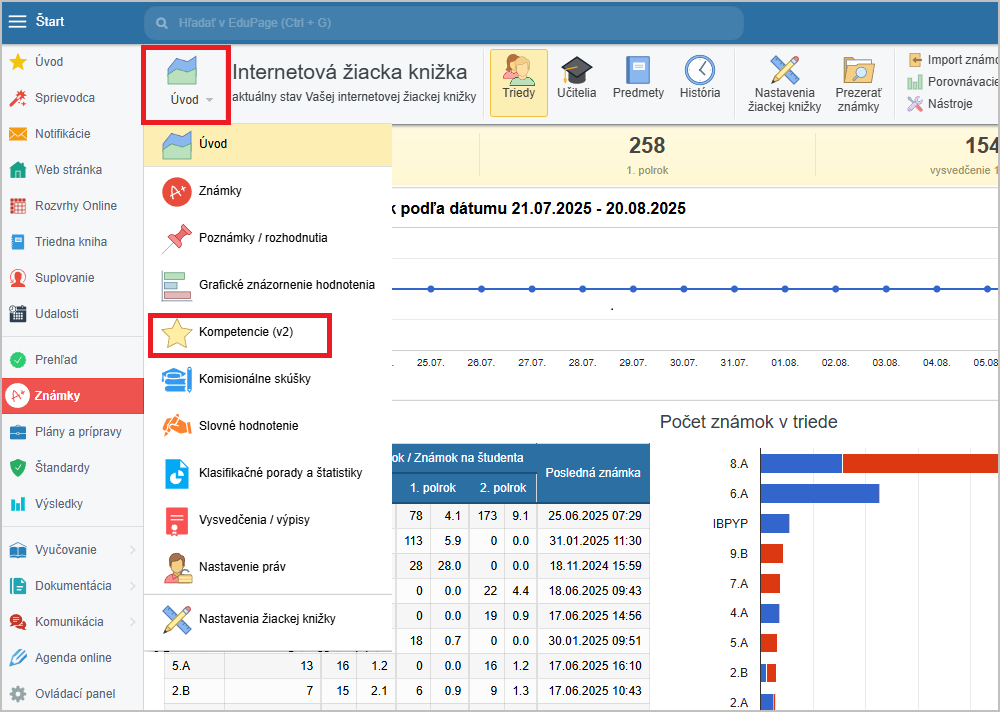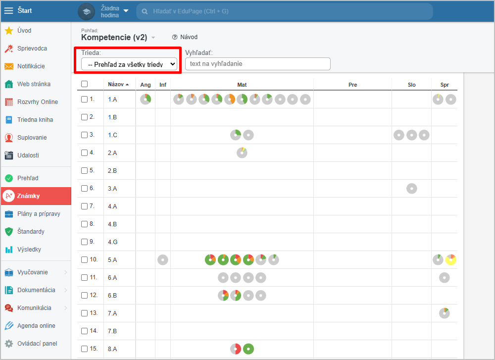 Administrátor si vie zobraziť prehľad hodnotenia kompetencií za všetky triedy.