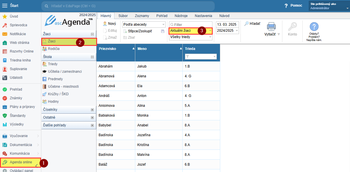 Poznámka: Ak si v menu nastavíte zobrazenie k určitému dátumu v minulosti, zobrazí sa zoznam aktuálnych žiakov platný k tomuto dátumu.