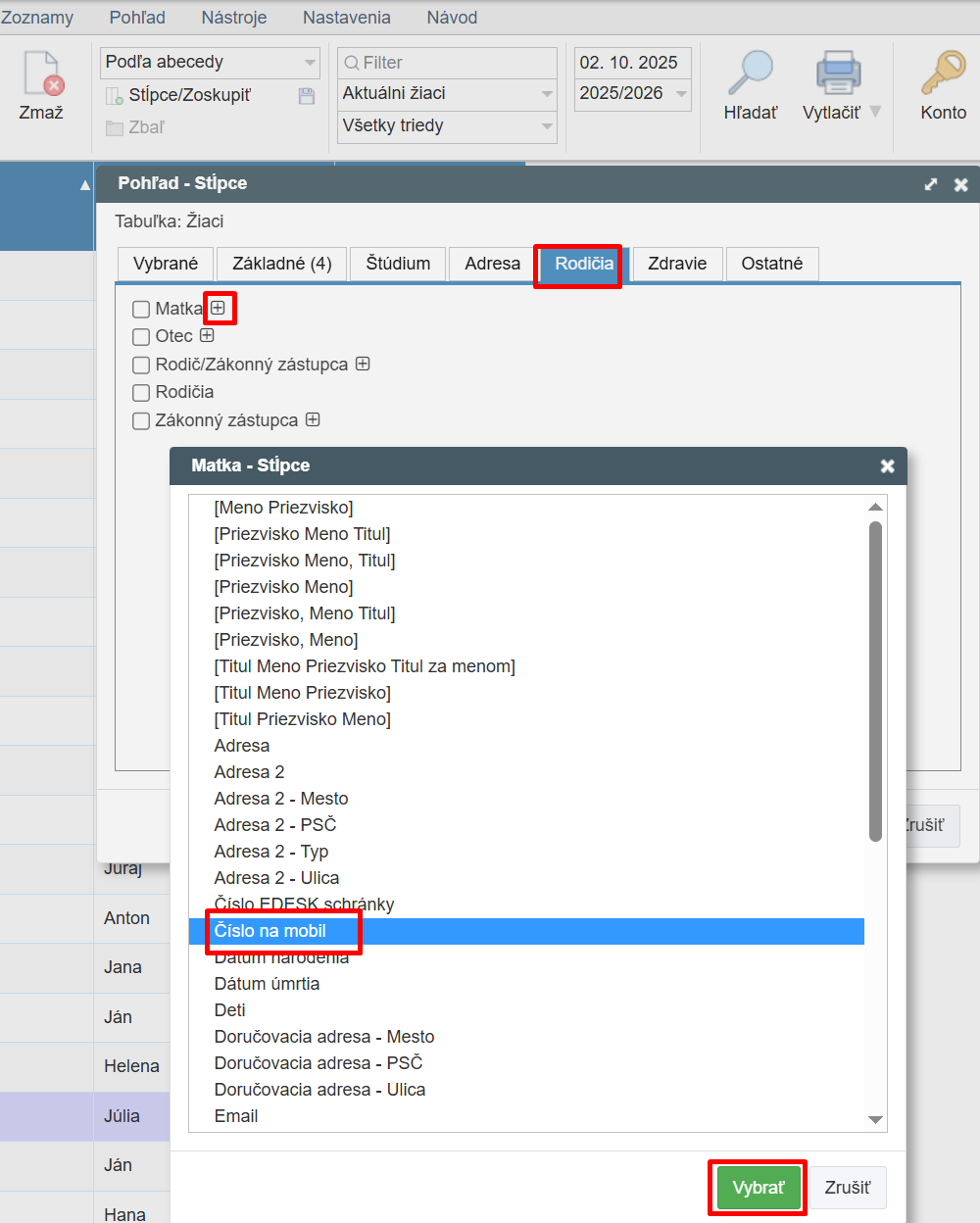 Máme vytvorené stĺpce s telefónnymi číslami rodičov a môžeme si tento zoznam vytlačiť.
