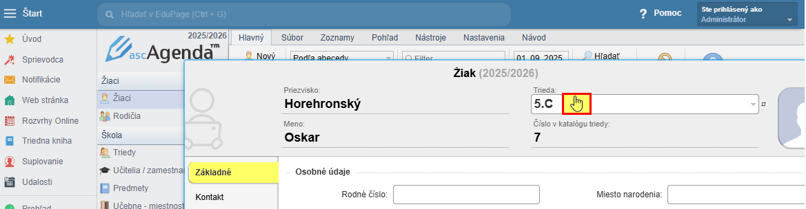 V našom príklade žiak Oskar prestupuje z 5.C triedy do 5.X triedy.