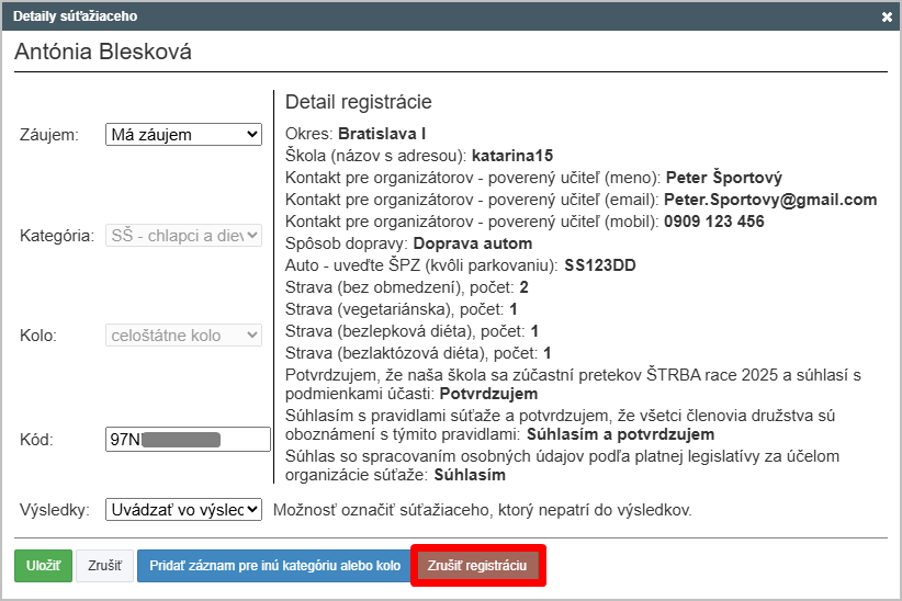 Kliknite na Detai v riadku súťažiaceho, ktorého registráciu chcete zrušiť.