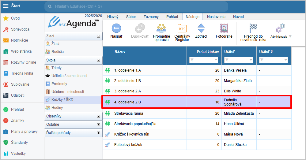 Hodiny pre ŠKD môže administrátor vytvoriť cez Agendu online. Tu máte aj prehľad o vytvorených hodinách pre krúžky a ŠKD.