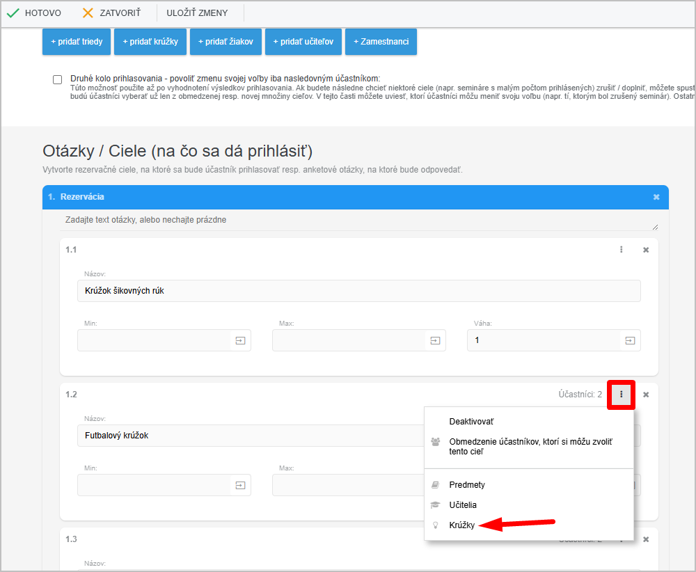 Odporúčame pri prihlasovaní na krúžky v sekcii Otázky/ciele zvoliť "pridať krúžky". Vďaka tomu viete po ukončení prihlasovacej akcie načítať deti do krúžkov, na ktoré sa prihlásili.