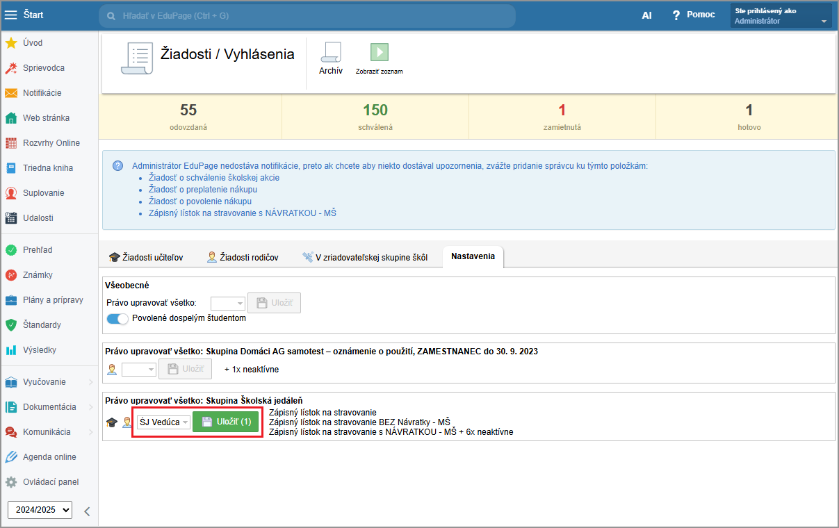 Triedny učiteľ môže spravovať žiadosti žiakov svojej triedy bez potrebného ďalšieho nastavenia. Toto právo má automaticky. Toto nastavenie je možné zmeniť.