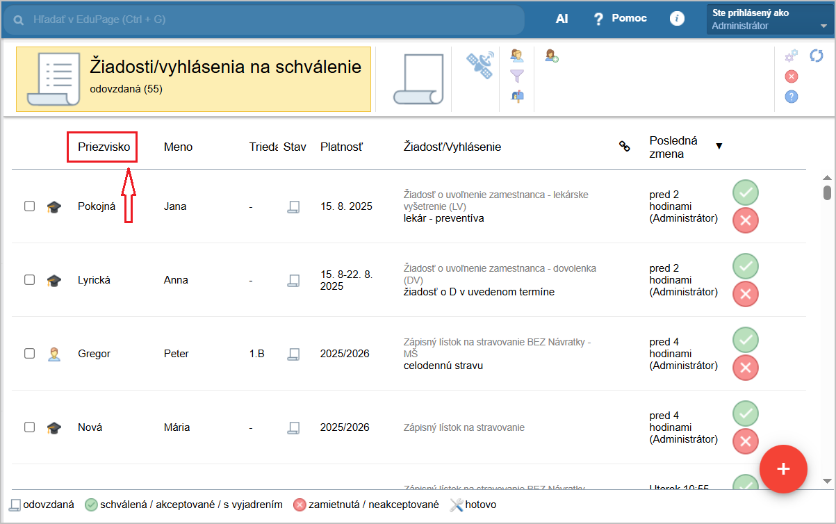 Ak si chcete zobraziť žiadosti podľa jedného parametra, kliknite na názov stĺpca - napr. Priezvisko: