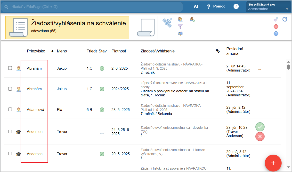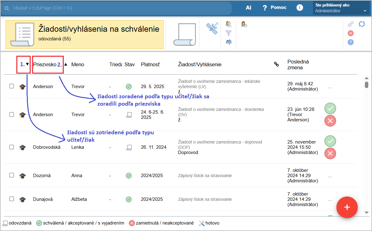 Niekedy je však potrebné zoradiť zoznam žiadostí podľa viacerých kritérií naraz - napr. podľa priezviska a typu konta - učiteľ/žiak.