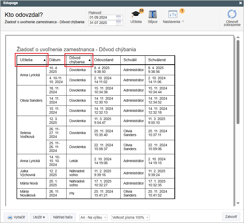 Pr.: škola potrebuje prehľad čerpania voľna za všetkých zamestnancov podľa dôvodov.