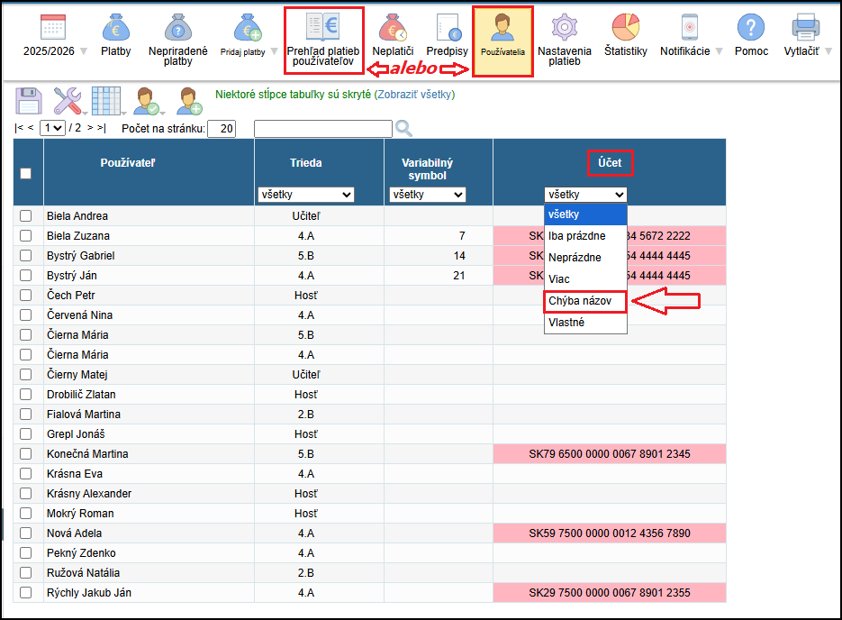 V module platby si v Používateľoch a Prehľade platieb používateľov môžete vyfiltrovať používateľov, ktorí nemajú zadaný názov účtu: