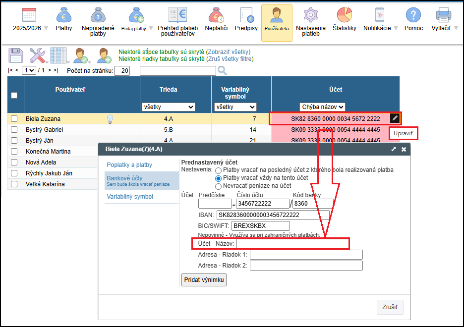 Názov účtu ukladá systém automaticky k používateľovi v prípade, že škola importuje kreditné platby z bankového výpisu alebo má škola aktivované automatické nahrávanie platieb a názov účtu je v platbe uvedený.