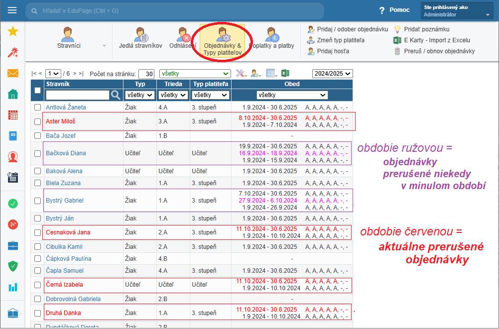 Stravníkov s prerušenými objednávkami môžete spolu s obdobím prerušenia vidieť v časti 'Objednávky & Typy platiteľov'.