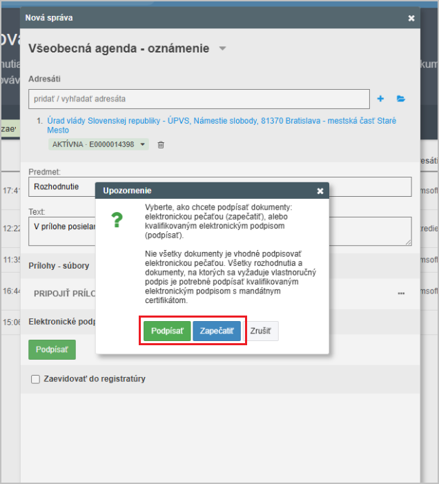 Ak máte elektronickú pečať, pri podpise a odosielaní správy sa Vás systém opýta ako chcete dokument podpísať: